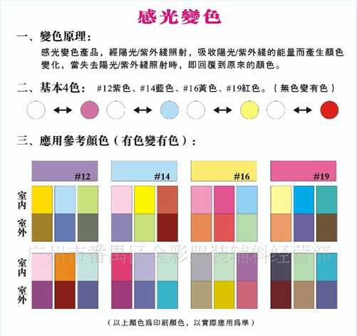 感光變色是經(jīng)紫外線或陽(yáng)光照射,吸收紫外線或陽(yáng)光后,而產(chǎn)生顏色的變化,當(dāng)失去紫外線或陽(yáng)光照射時(shí),即回復(fù)到原來(lái)的顏色。