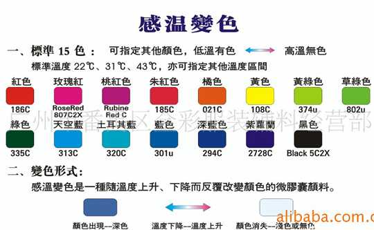 1、感溫變色粉為微膠囊化的可逆感溫變色物質(zhì)稱為可逆感溫變色顏料(俗稱:溫變顏料,感溫粉或溫變粉)。