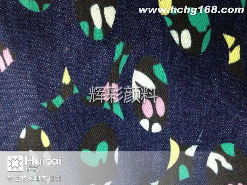 為解決拔白漿拔不白的難題,一般在靛蘭牛仔坯布上常規(guī)網(wǎng)印或機(jī)印拔染出花紋、圖案,經(jīng)烘干、水洗、烘干,制得藍(lán)底帶花的印花牛仔布;或在水洗工序后經(jīng)過(guò)固色劑水溶液處理,再水洗至中性、烘干,制得藍(lán)底白花的印花牛仔布。