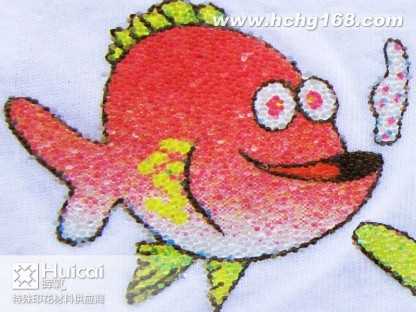 先印輝彩印花材料的HC-800粘珠漿一次吹干打底,然后再印第二次時以膠珠的大小來確定印粘珠漿的厚度,或是印第三次粘珠漿以便留有足夠的粘珠漿